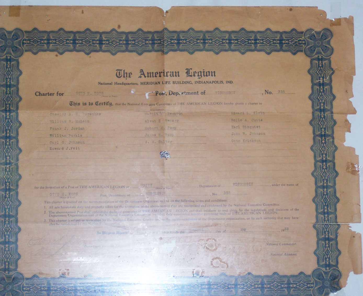 American Legion Post 358, Unity, Wisconsin was chartered in May 1922 as the Otto H. Kops Post.